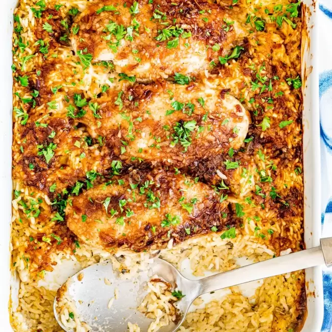 - Finish the dish: Bake for 1 hour and 15 minutes or until the chicken is cooked through and rice is tender. Garnish with parsley and serve warm!