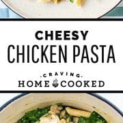 This Cheesy Chicken Pasta is the perfect dinner any night of the week. It’s packed with creamy, rich, cheesy goodness, with some tender chicken and spinach to balance everything out! Only 10 minutes of prep time and all done in one pot!