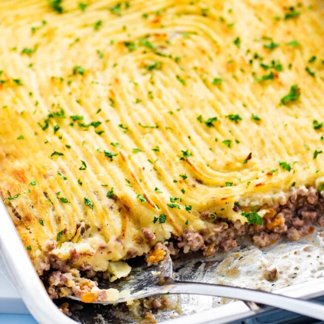 Shepherd’s pie, also known as “cottage pie” (when made with beef) is a crustless meat pie with a mashed potato topping.