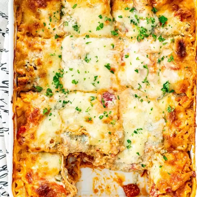 Buffalo Chicken Lasagna is about to be your new favorite twist on a classic. Full of hot buffalo wing sauce, tender chicken, and cheese galore, this dish combines 2 drool worthy meals to make the most scintillating and sizzling lasagna you’ve ever tasted.