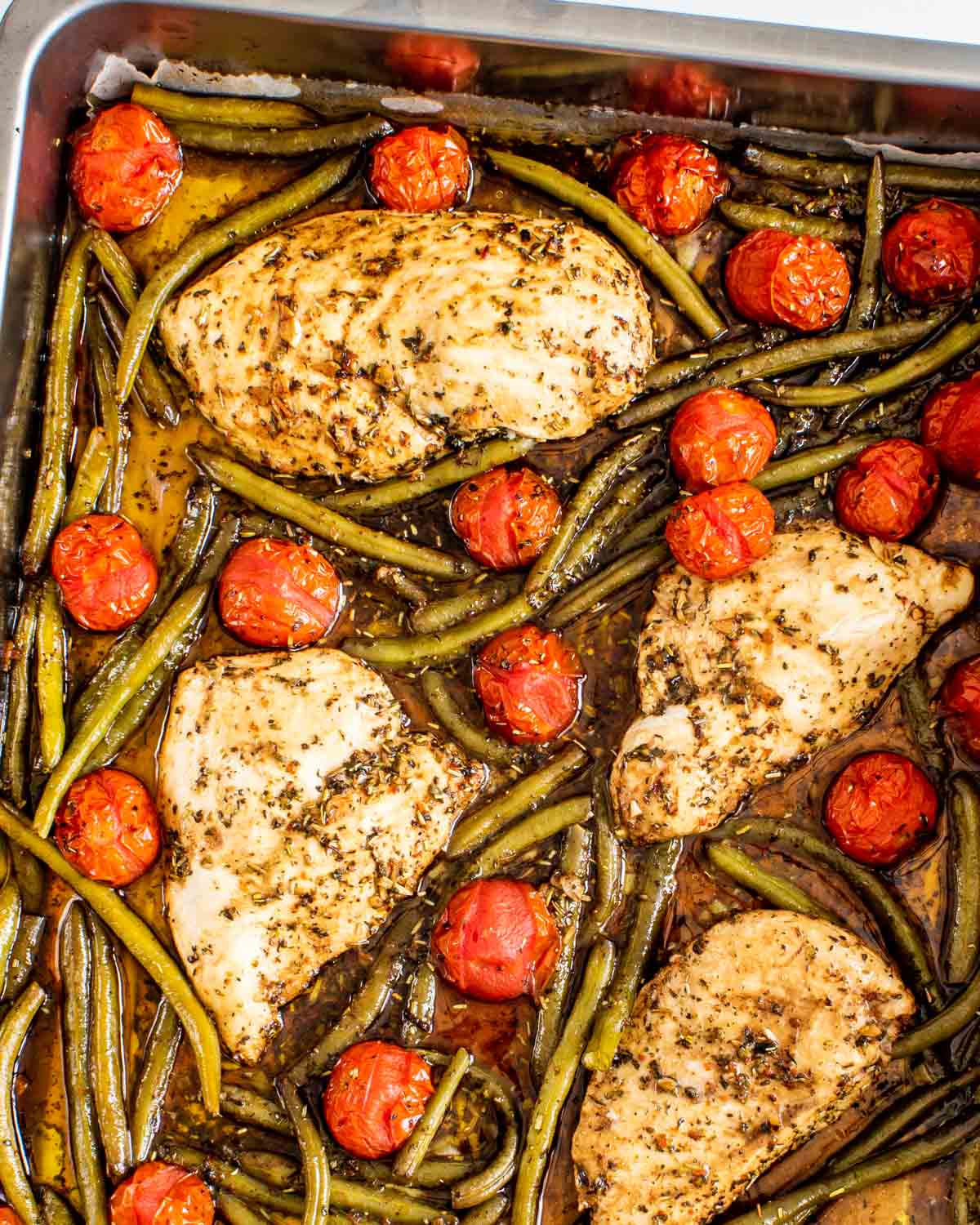 An incredibly quick and easy Italian Chicken Sheet Pan Dinner that’s a complete meal on its own. Tender and juicy chicken breasts with perfectly roasted green beans and cherry tomatoes tossed in a delicious Italian dressing all ready in just 30 minutes. Perfect for busy weeknight dinners and meal prep.